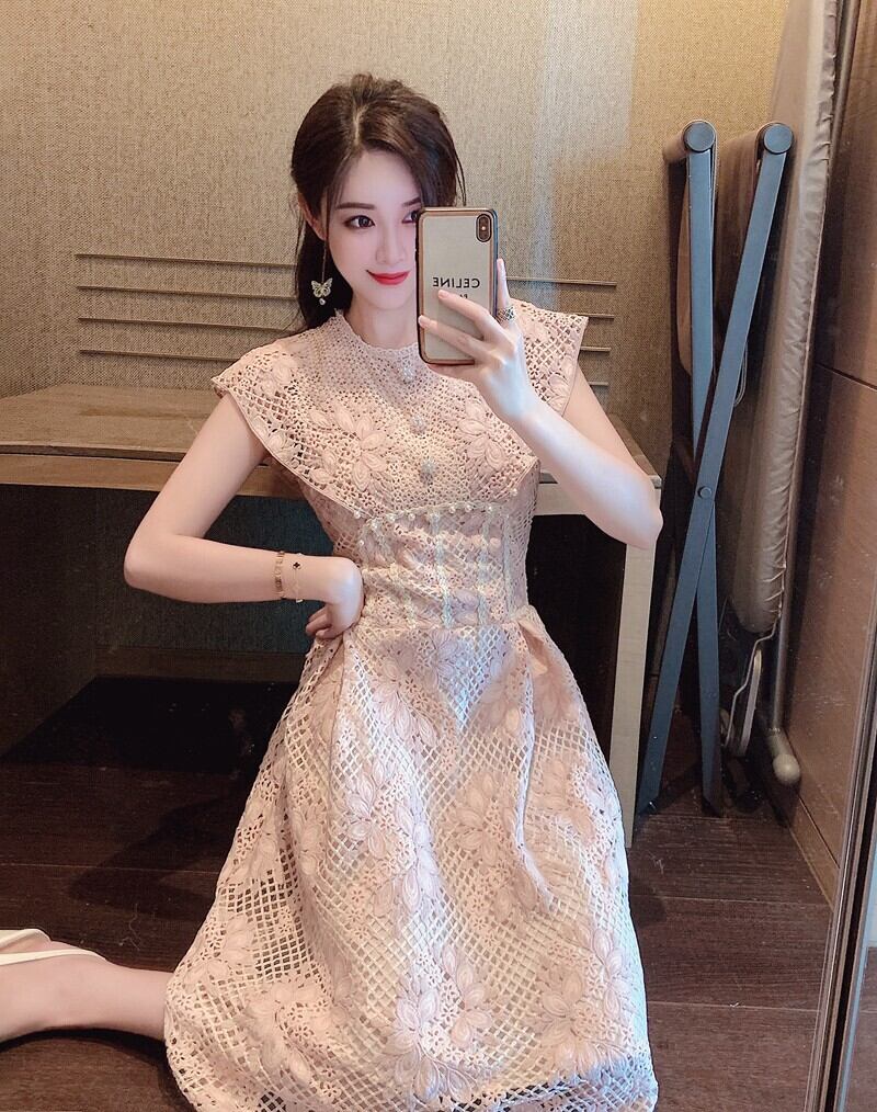 SMTHMA ラグジュアリー ランウェイ ノースリーブ サマードレス レディース 刺繍 フラワー レース 中空アウト スウィート ロングドレス 大人ガーリー キュート カジュアル 夏物 フラワーデザイン | two