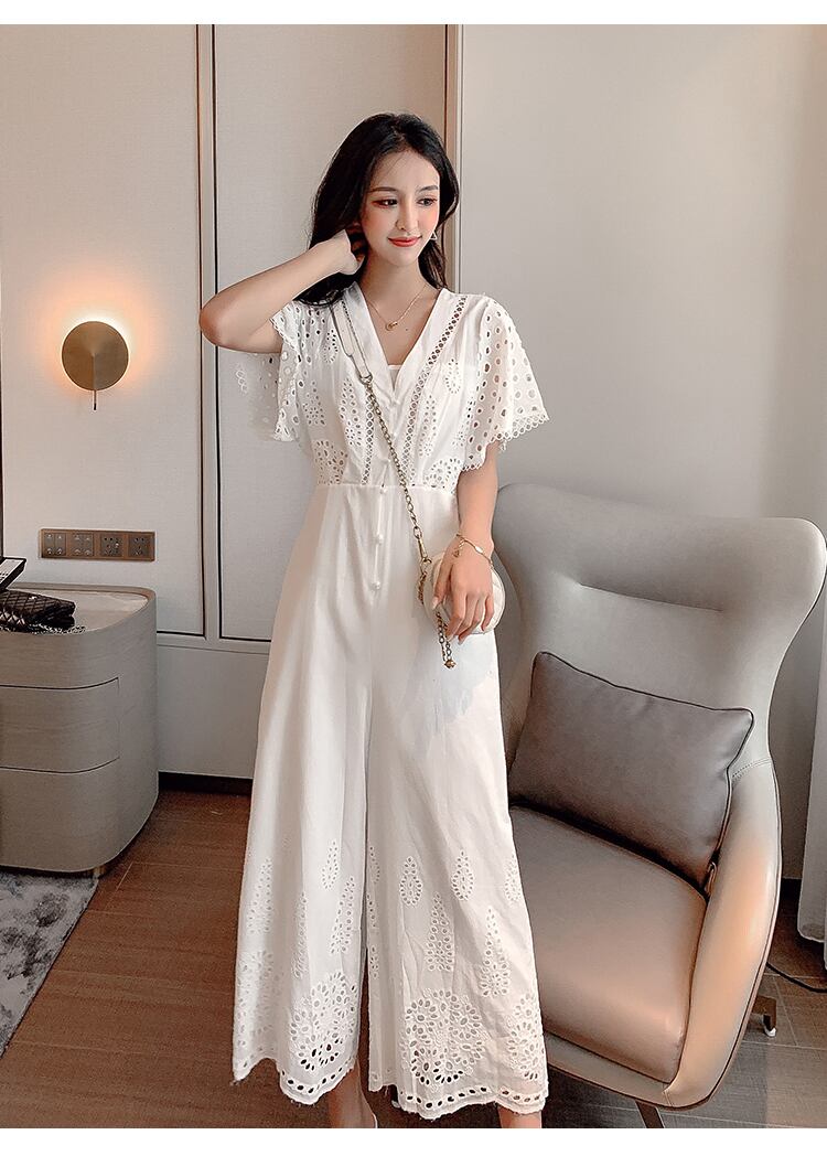 SMTHMA 女性ロンパース夏ワイドレッグオーバーオールレース中空アウト半袖ジャンプスーツウエストロンパース ショート ハーフスリーブ サマー 夏物 ワイドパンツ