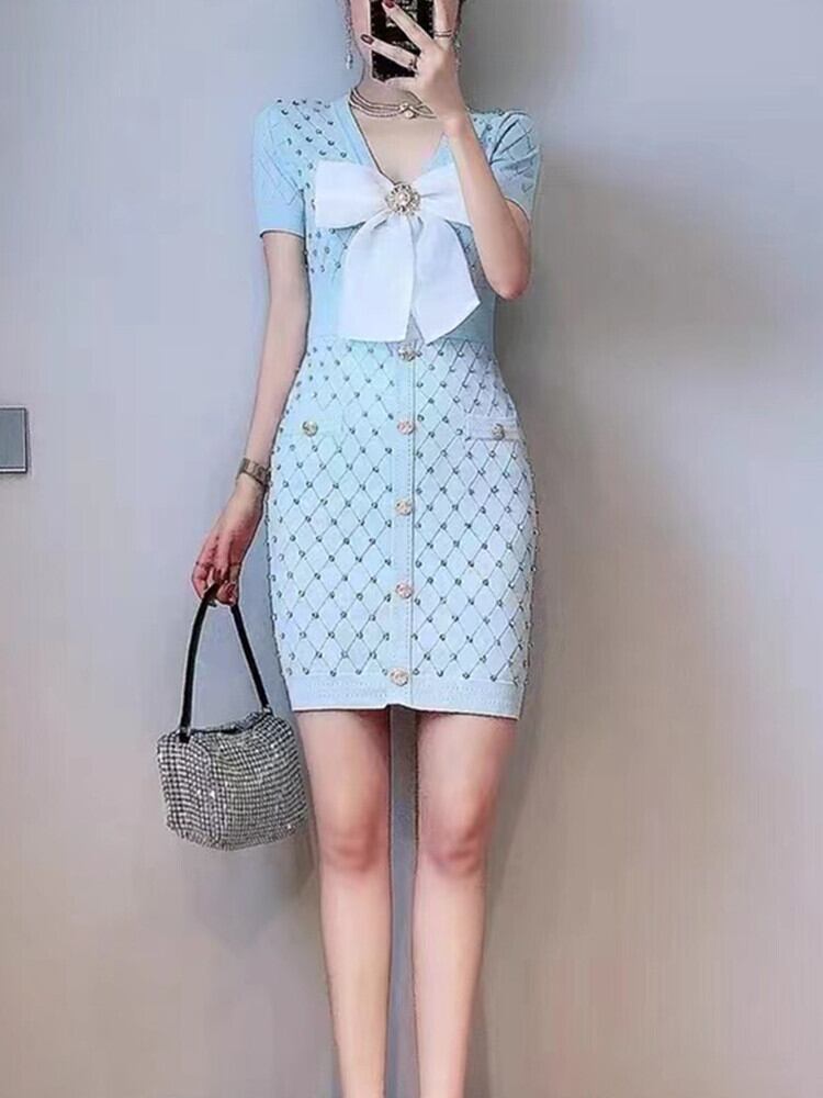 SMTHMA 女性ニットサマードレス半袖セクシーな V ネック弾性スリムドレスセクシーなダイヤモンドボウボディコンセータードレス ショート リボン ハーフスリーブ エラスティック 伸縮 夏物 Vネック | two