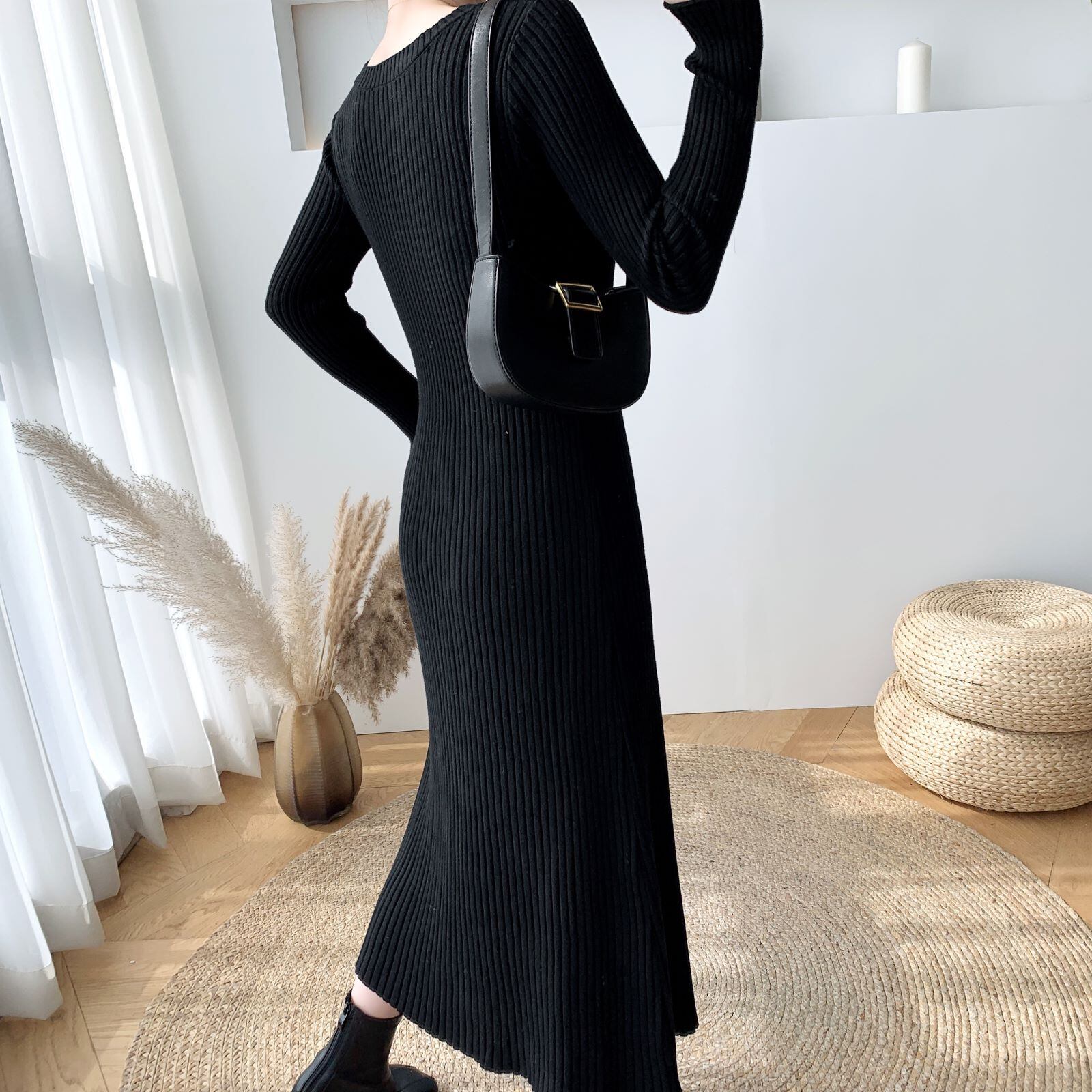 SMTHMA 秋冬スクエアカラーソリッドニットドレス女性フルスリーブスリムウエストミッドカーフセータードレス Vestidos オータム 秋物 ウィンター 冬物 ソリッドカラー スクウェア | two