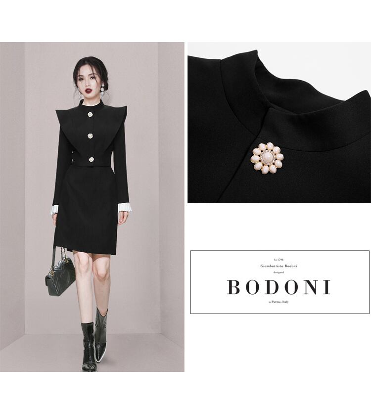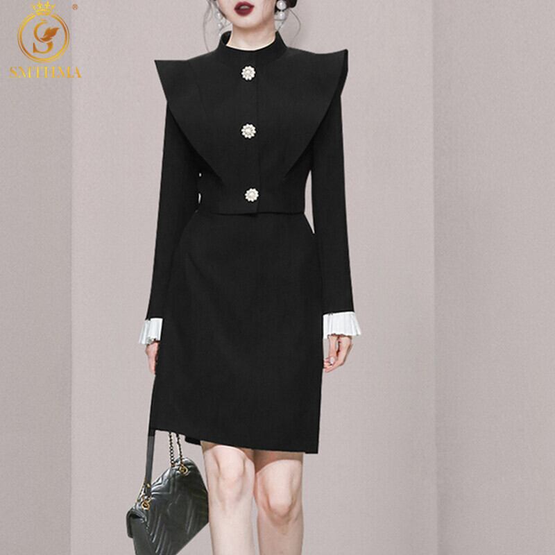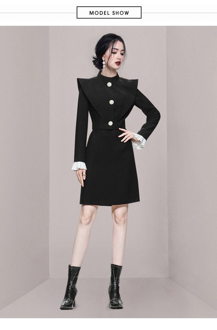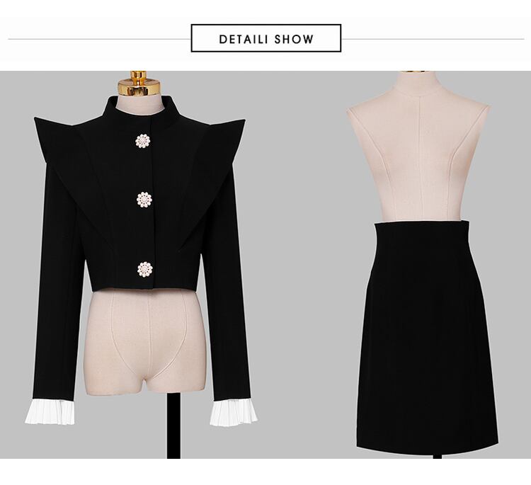 黒ツーピースセット女性秋できるダイヤモンドボタンジャケットコート + ウエストスカートスーツ ブラック オータム 秋物
