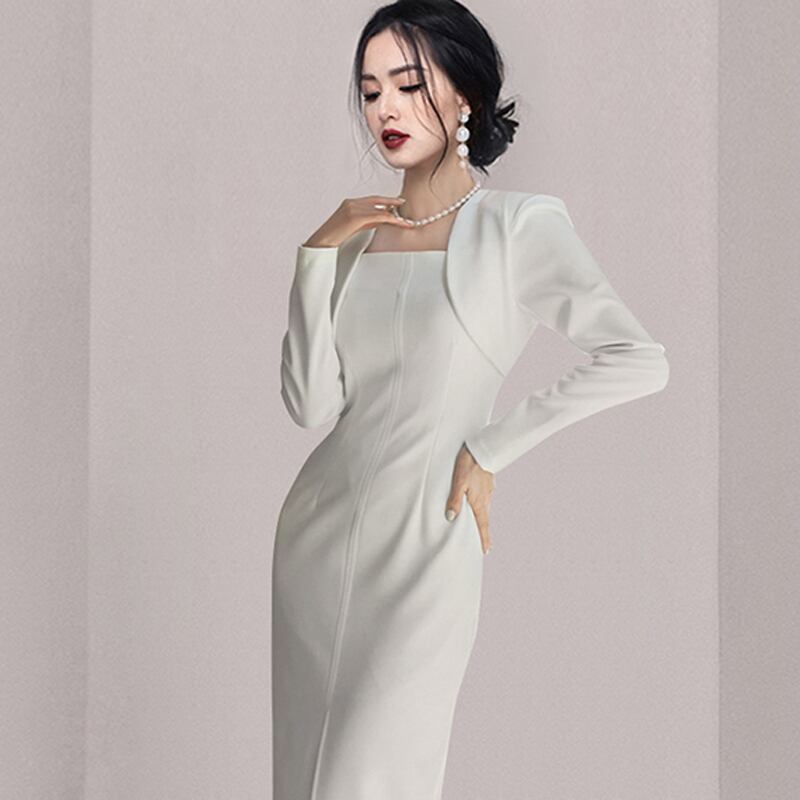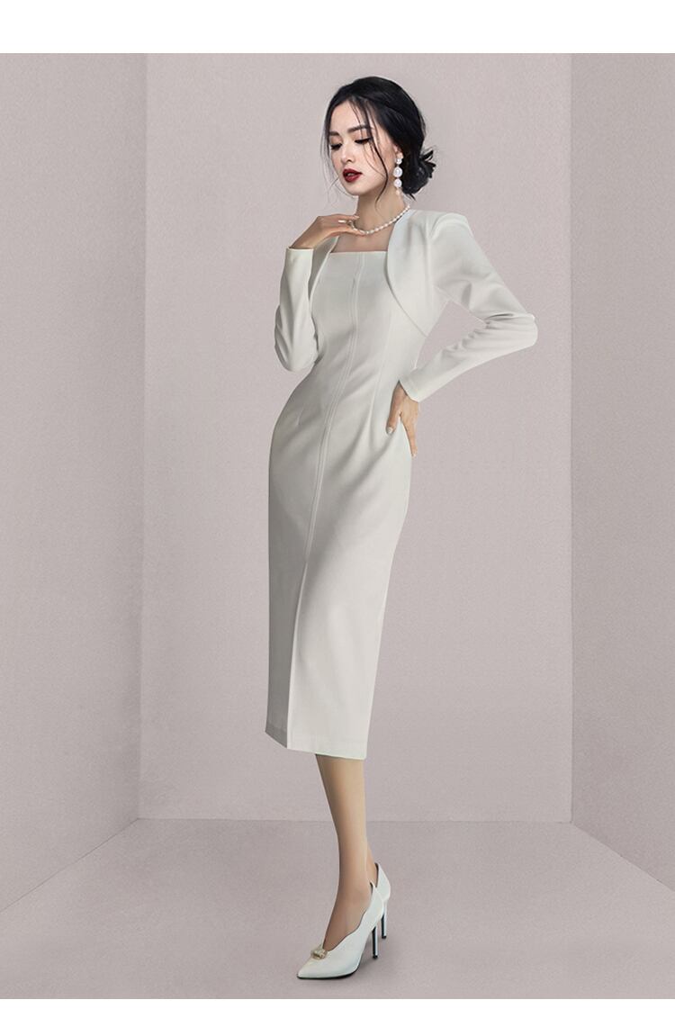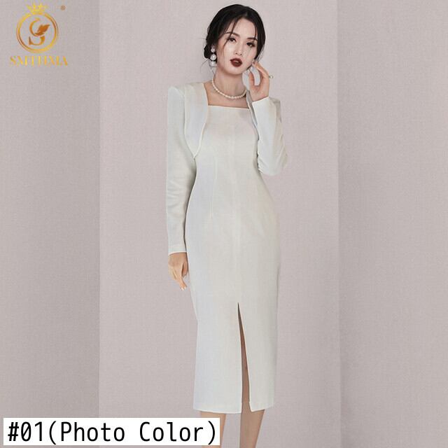 SMTHMA 春 OL 気質 スリム ドレス スクエア カラー 長袖 ホワイト セクシー スプリット ドレス ロング スプリング 春物 スクウェア