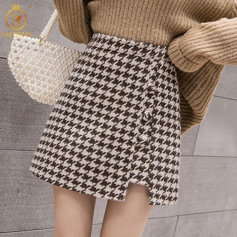 SMTHMA 千鳥格子チェック柄ツイードスカート女性ウエスト非対称ミニスカート秋 A ラインスカート オータム 秋物 Aライン