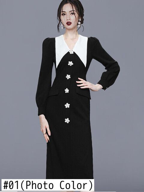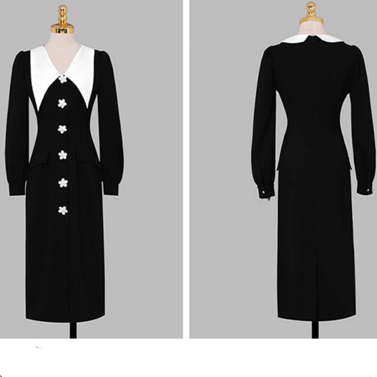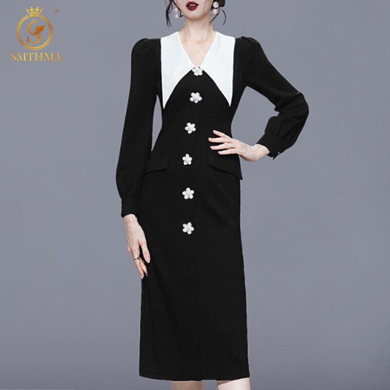 SMTHMA 女性ドレス秋のドレスソリッドピーターパンカラー黒花ビーズの女性のドレス Vestidos ブラック オータム 秋物 ソリッドカラー フラワーデザイン