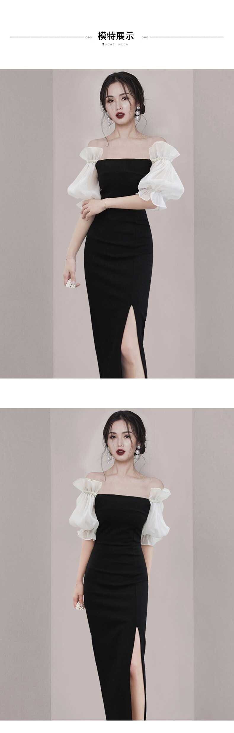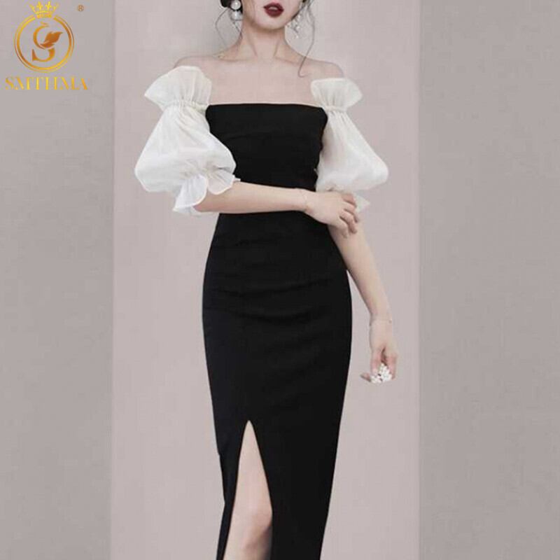 SMTHMA セクシーなオフショルダーサマーロングドレスパフスリーブメッシュパッチワークスプリットブラック Vestidos 夏物