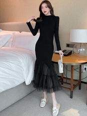 SMTHMA 秋冬ニットメッシュパッチワークマーメイドドレス女性の長袖ソリッドセータードレス Vestidos ロング オータム 秋物 ウィンター 冬物 ソリッドカラー
