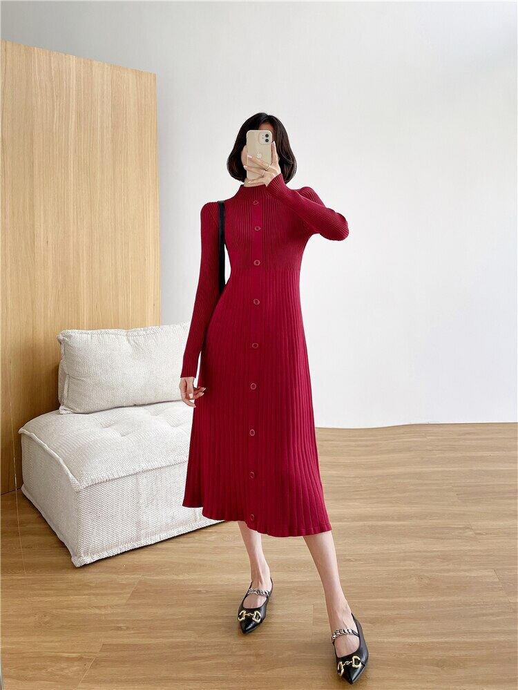 SMTHMA ニットハーフタートルネックミディセータードレス秋冬女性長袖弾性ドレススリム Vestidos ロング エラスティック 伸縮 オータム 秋物 ウィンター 冬物