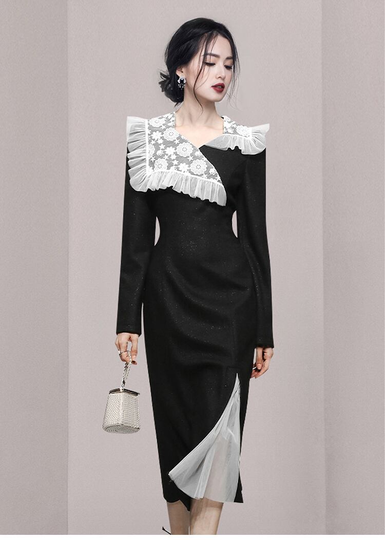 SMTHMA 女性ドレスピーターパンカラー長袖パッチワークフリルミディドレス Vestidos ロング