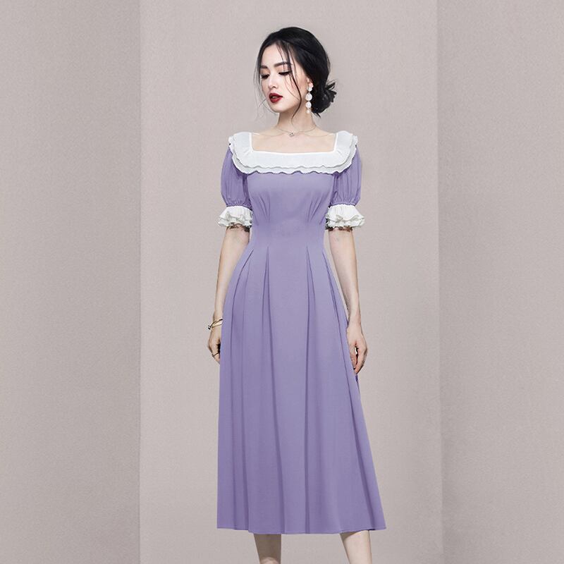 SMTHMA レディース 夏 スクエアネック ドレス ランタンスリーブ パールレース フリル スリムウエスト ビッグスイングワンピース サマー 夏物 真珠 スクウェア