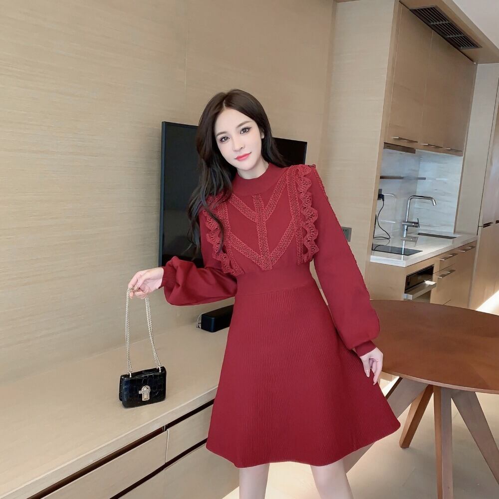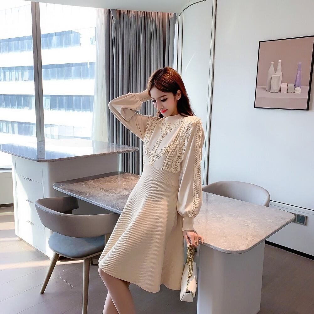 SMTHMA 秋/冬のレースのパッチワークニットドレス女性女の子スウィートランタンスリーブセーター A ライン Vestidos 大人ガーリー キュート カジュアル オータム 秋物 ウィンター 冬物 Aライン | two