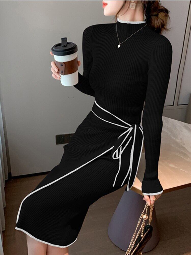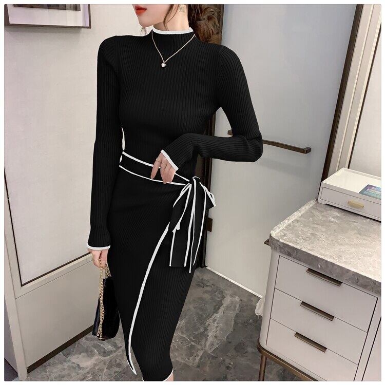 SMTHMA ニット ワンピース ドレス秋冬セータードレス - エンド気質スリムレースアップドレス Vestidos オータム 秋物 ウィンター 冬物