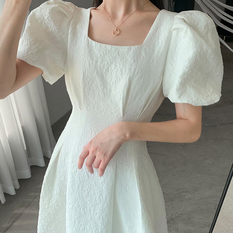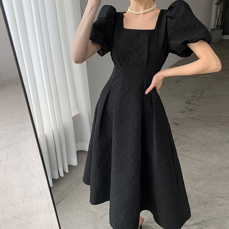 SMTHMA 女性の夏の黒、白の固体ミディドレスレディパフ半袖ジャカードドレス Vestdios ショート ホワイト ブラック ハーフスリーブ サマー 夏物 ソリッドカラー