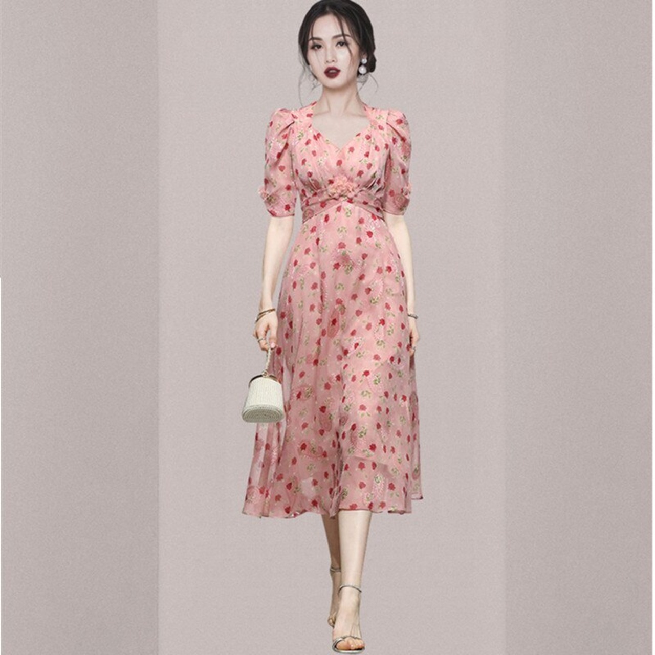 SMTHMA サマードレス女性パフスリーブプリントシックなドレス Vestidos 女性 夏物