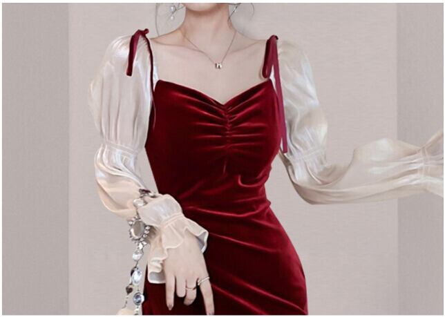 SMTHMA Speing 気質フレンチ セクシー スパゲッティ ストラップ ドレス ローブ女性の長袖ベルベット Vestido ロング