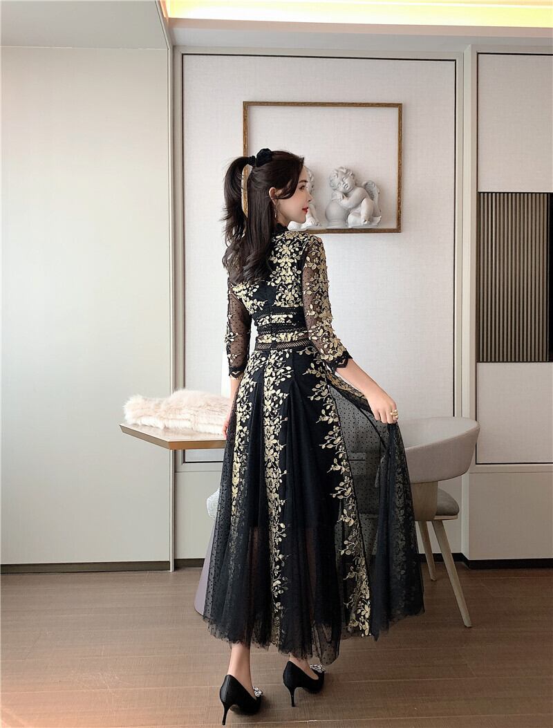 SMTHMA 女性滑走路ロングドレスセクシーな V ネックウエストパッチワークメッシュレース刺繍ドレス Vネック