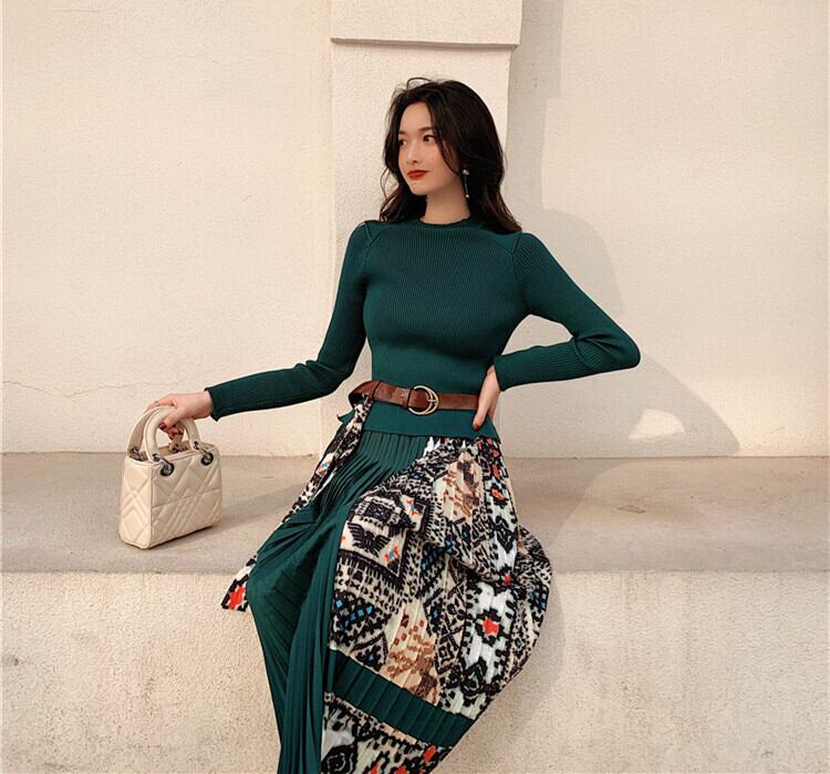 SMTHMA 春ニットパッチワークプリーツミディドレス女性長袖滑走路印刷シックなドレス ロング スプリング 春物