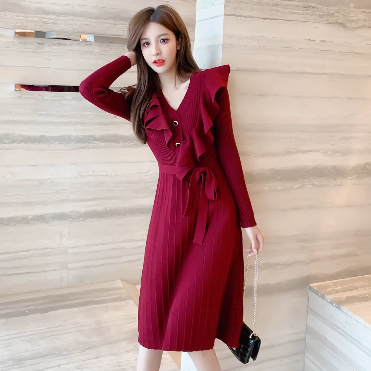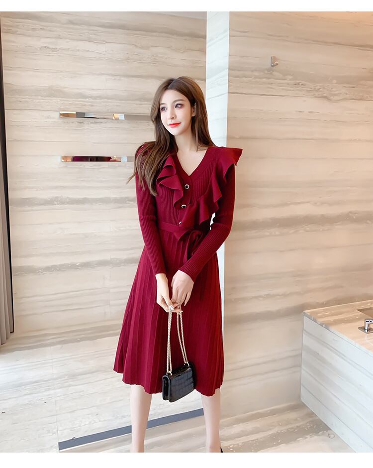 SMTHMA 秋と冬のガールスウィートフリル長袖ニットドレスセクシーな V ネックシングルブレストドレス Vestidos ベルト ロング 大人ガーリー キュート カジュアル オータム 秋物 ウィンター 冬物 ハーネス Vネック | two
