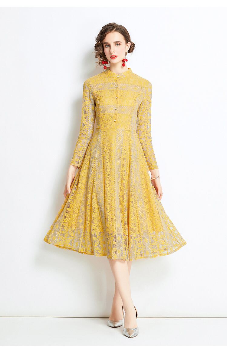 SMTHMA 秋黄色レース中空アウトドレス女性の長袖スタンドカラーパーティーミディドレス Vestidos ロング オータム 秋物