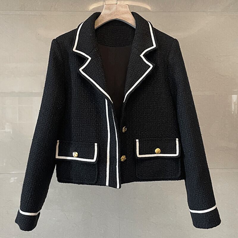 SMTHMA 黒、白パッチワークツイードジャケット WomenTurndown 襟高級ウールコートオフィスレディ秋冬生き抜く ホワイト ブラック オータム 秋物 ウィンター 冬物 会社 学校 通勤や通学にも