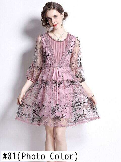 SMTHMA ランウェイ フラワー メッシュ エンブロイダリー ミニドレス ハーフスリーブ エンド レースアップドレス 半袖 刺繍 フラワーデザイン
