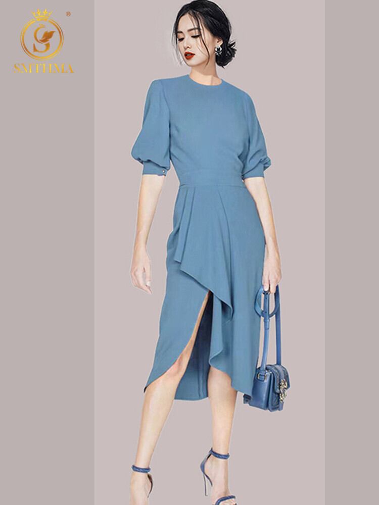 SMTHMA フレンチエンド レディース レースアップ サマードレス スリムウエスト ミッドレングス ブルー 非対称ドレス 夏物