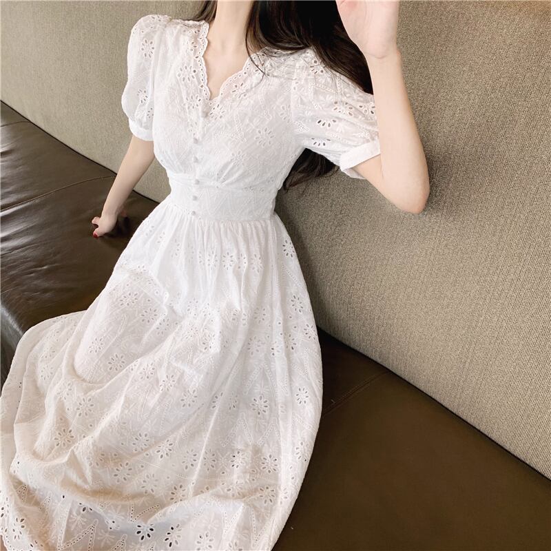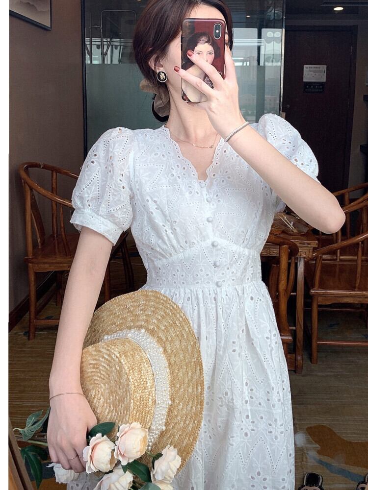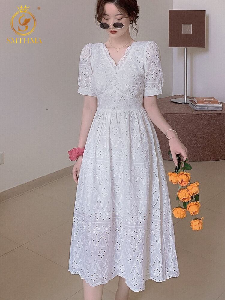 SMTHMA レディース スウィート ホワイト サマードレス 半袖 レース 中空アウト 刺繍ドレス Vestidos ショート ハーフスリーブ 大人ガーリー キュート カジュアル 夏物