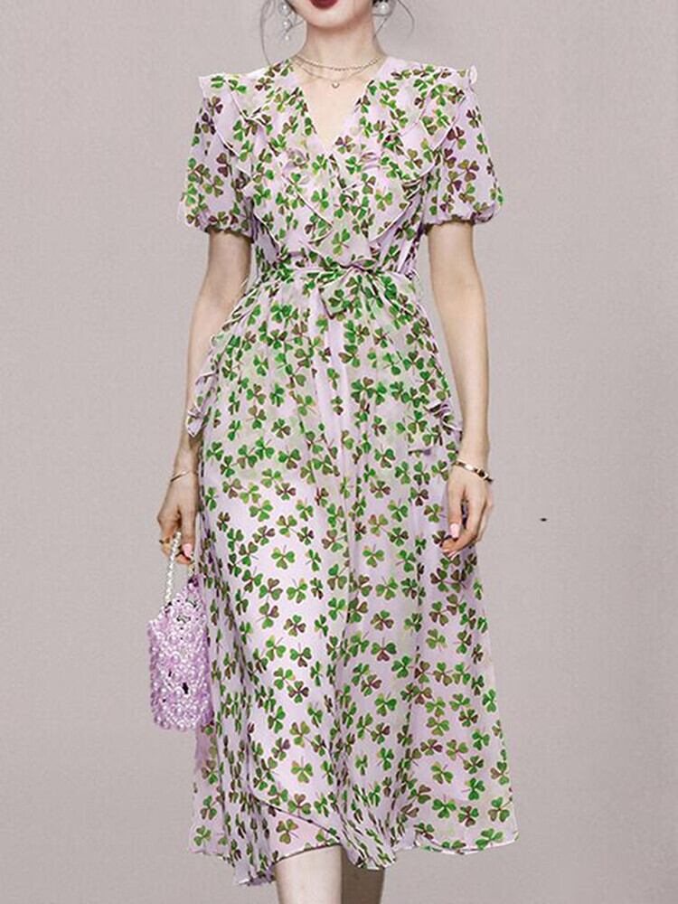 SMTHMA ドレス女性プリント V ネック パフ スリーブ エンパイア スリム ドレス服 Vestidos 夏 サマー 夏物 Vネック