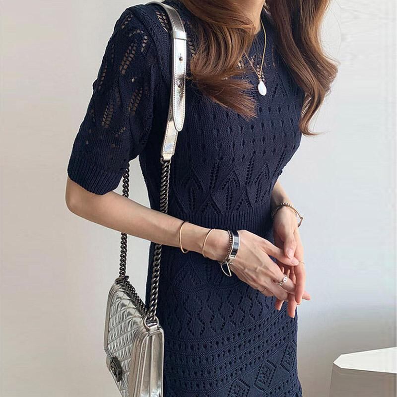 SMTHMA 滑走路秋冬シックなニットセータードレス中空アウトニットスリムプリーツストレッチドレス オータム 秋物 ウィンター 冬物