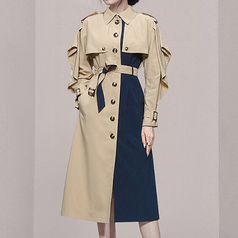 SMTHMA シングルブレスト パッチワーク トレンチコート レース ベルト付き スリムウエスト ウインドブレーカー ロング ルーズ アウター レディース ハーネス