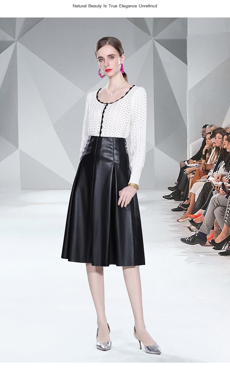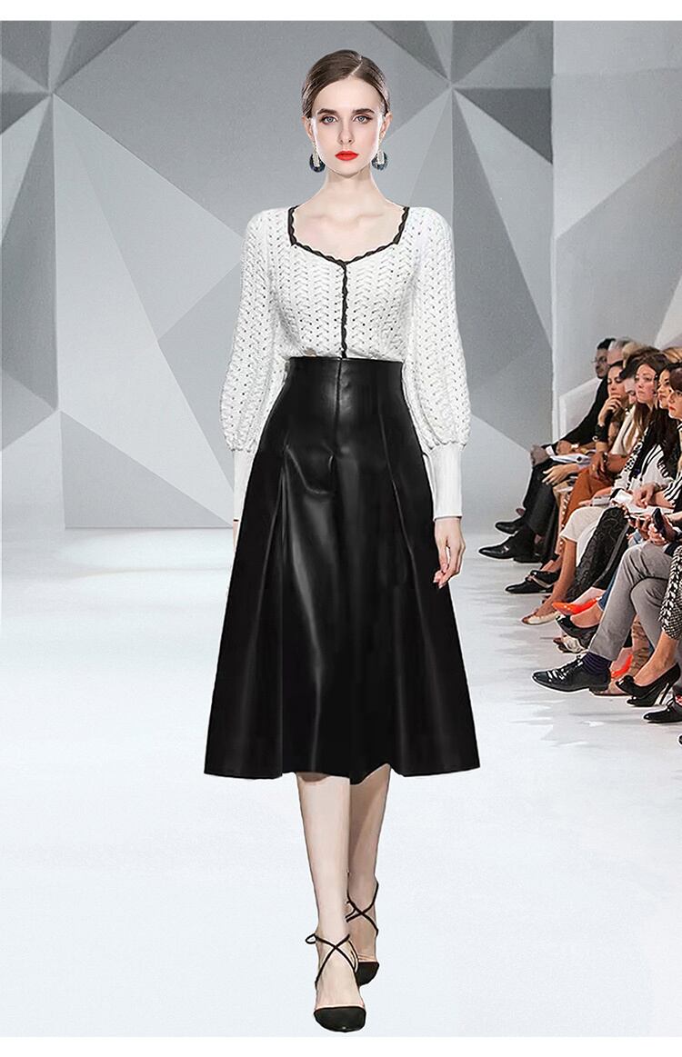 SMTHMA ニット セーター 2 点セット スリム ウエスト ブラック PU レザー スカート レディース スーツ