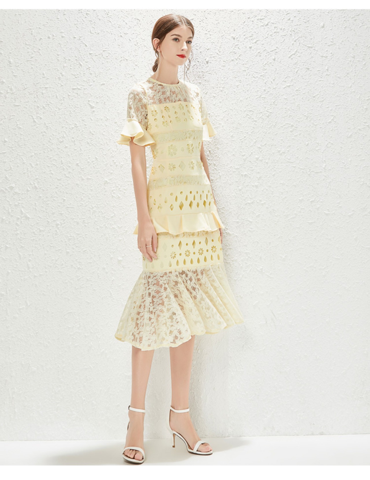 SMTHMA 滑走路夏人魚ドレス女性の O ネック黄色レース中空アウト パーティー ホリデー ドレス Vestidos サマー 夏物 Oネック