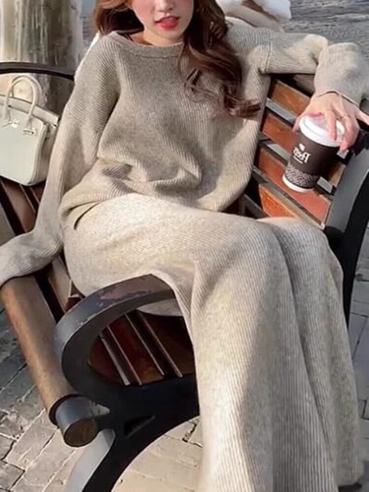 SMTHMA 冬ニット二枚スーツ O ネックルーズニットトップ + ワイド Led 長ズボン女性厚いセーターセット ロング ウィンター 冬物 Oネック