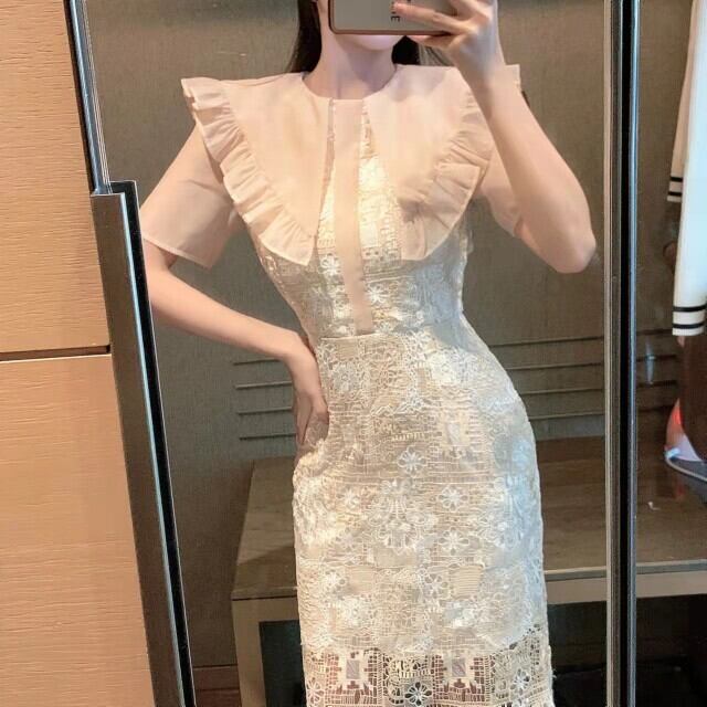 SMTHMA ランウェイ サマー レース 中空アウト 刺繍 ドレス レディース 半袖 フリル ロングドレス ショート ハーフスリーブ 夏物