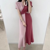SMTHMA レディース パッチワーク 半袖 サマードレス フレンチ ミドルレングス ロングドレス Vestidos ショート ハーフスリーブ 夏物