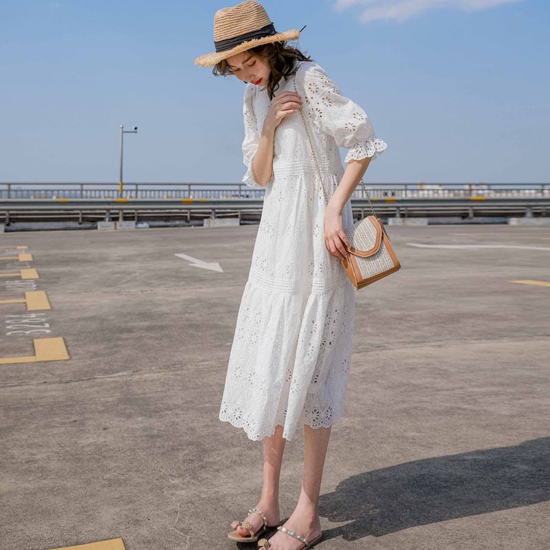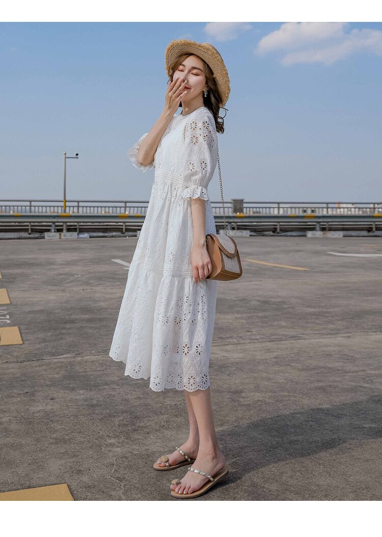 SMTHMA サマー レース ホロウ アウト ホワイト ドレス レディース ルーズ ミッドレングス ドレス Vestidos 夏物