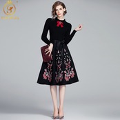 女性長袖セーターパッチワークドレスセクシーな秋冬ドレス女性 O ネック刺繍ニットドレス ロング オータム 秋物 ウィンター 冬物 Oネック