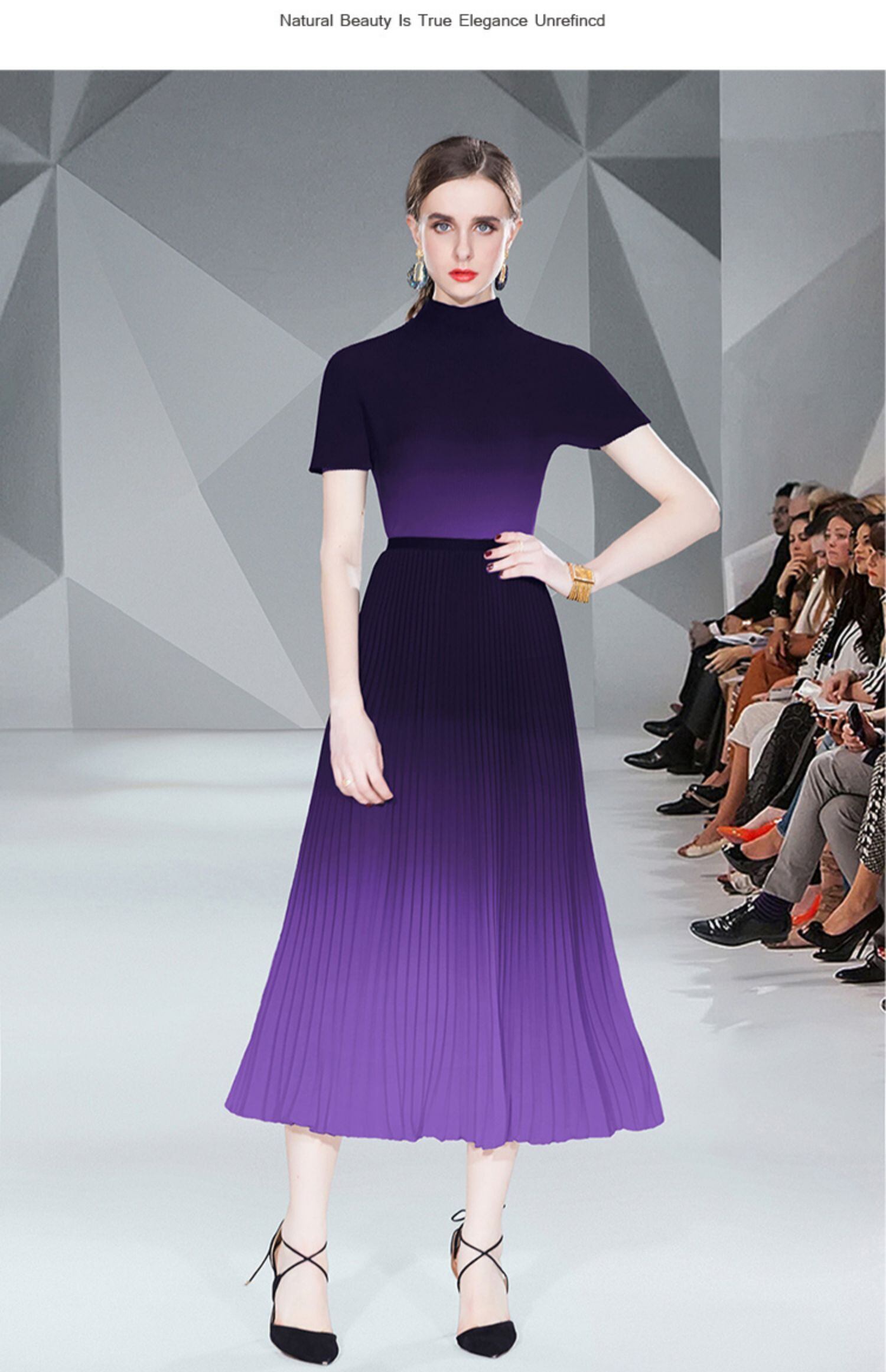 SMTHMA グラデーション 汚れ シワ スタンドカラー 半袖 トップス ツーピース セット + ウエストゴム プリーツ スカート スーツ ショート ハーフスリーブ エラスティック 伸縮