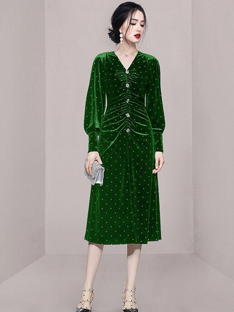 SMTHMA セクシーな V ネック パフ スリーブ ドレス女性のスリムなウエスト ミッドレングス グリーン ベルベット ドレス Vestidos Vネック