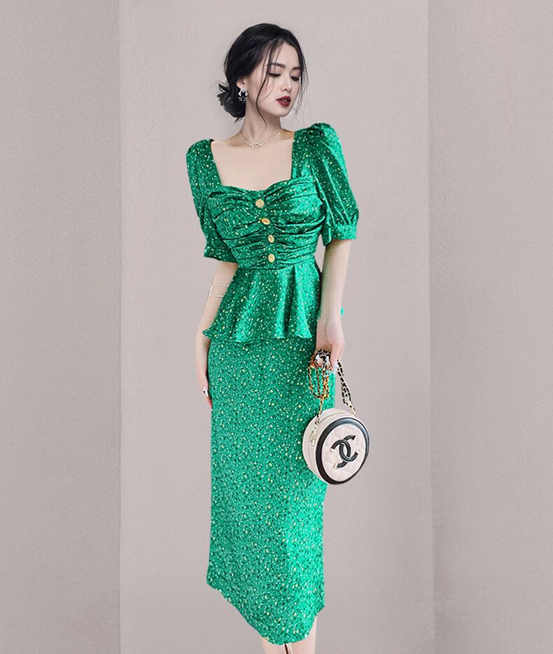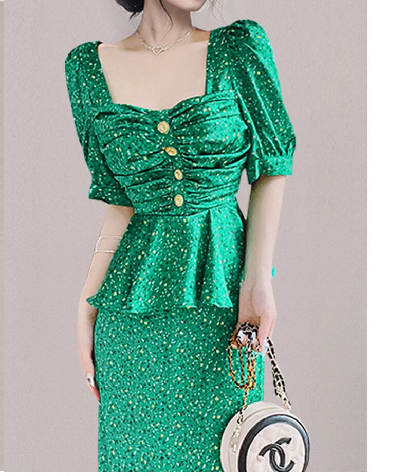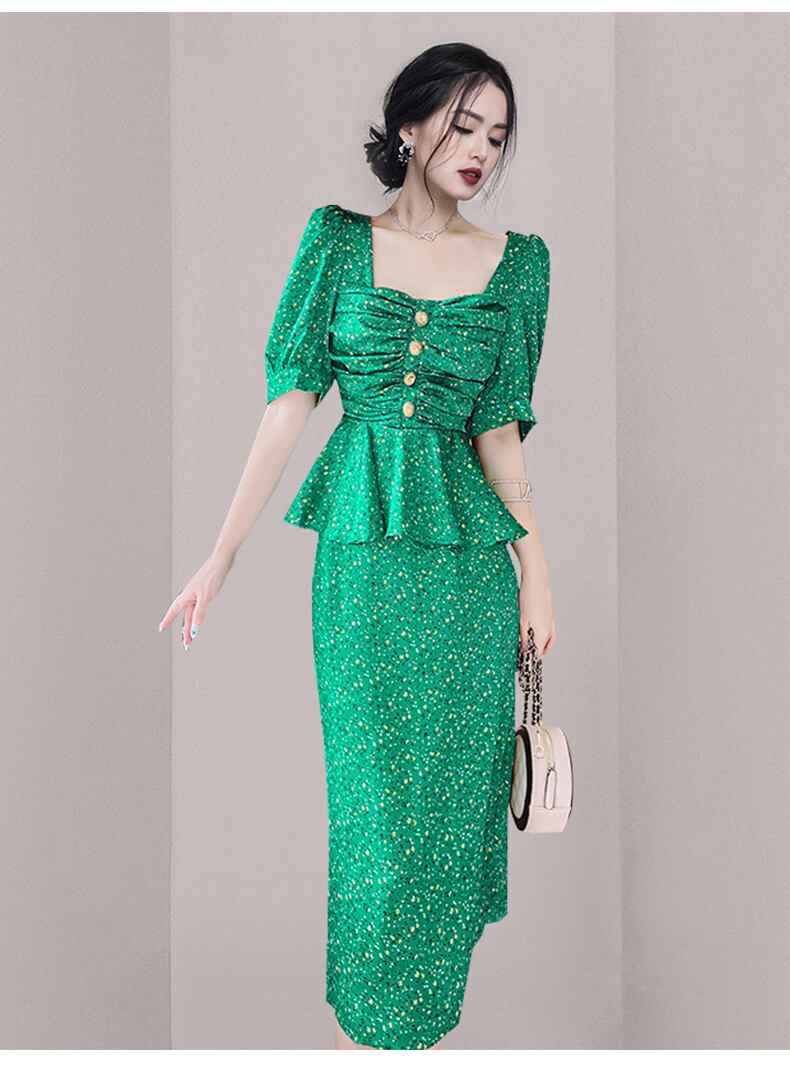 SMTHMA レディース セクシー パフスリーブ フリル ブラウス + ウエスト ツーピース プリント 染色 スカート スーツ
