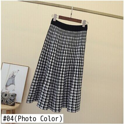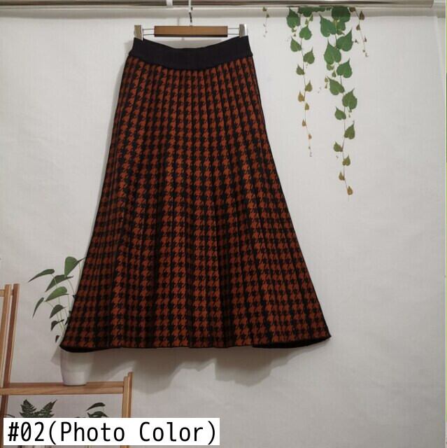 SMTHMA 秋と冬のヴィンテージストレッチウエストミディプリーツ千鳥格子プリントニットスカート女性滑走路スカート オータム 秋物 ウィンター 冬物 ビンテージ