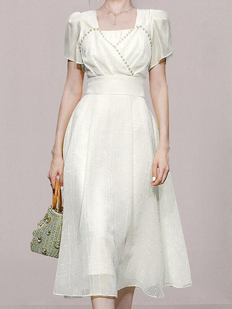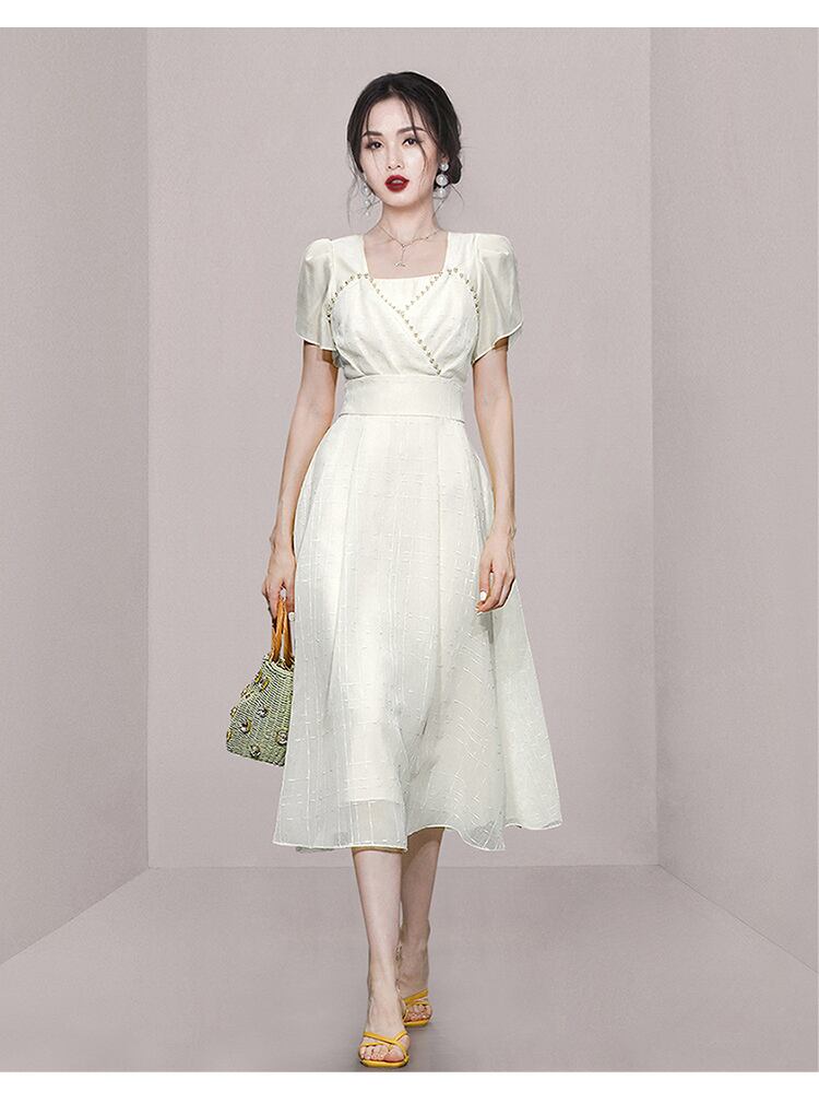 SMTHMA パフスリーブ スクエアネック サマーロングドレス ビーズ Aライン ゆったりミディワンピース レディース フレンチ 夏物 スクウェア