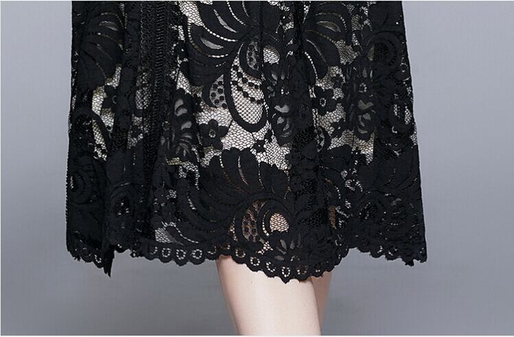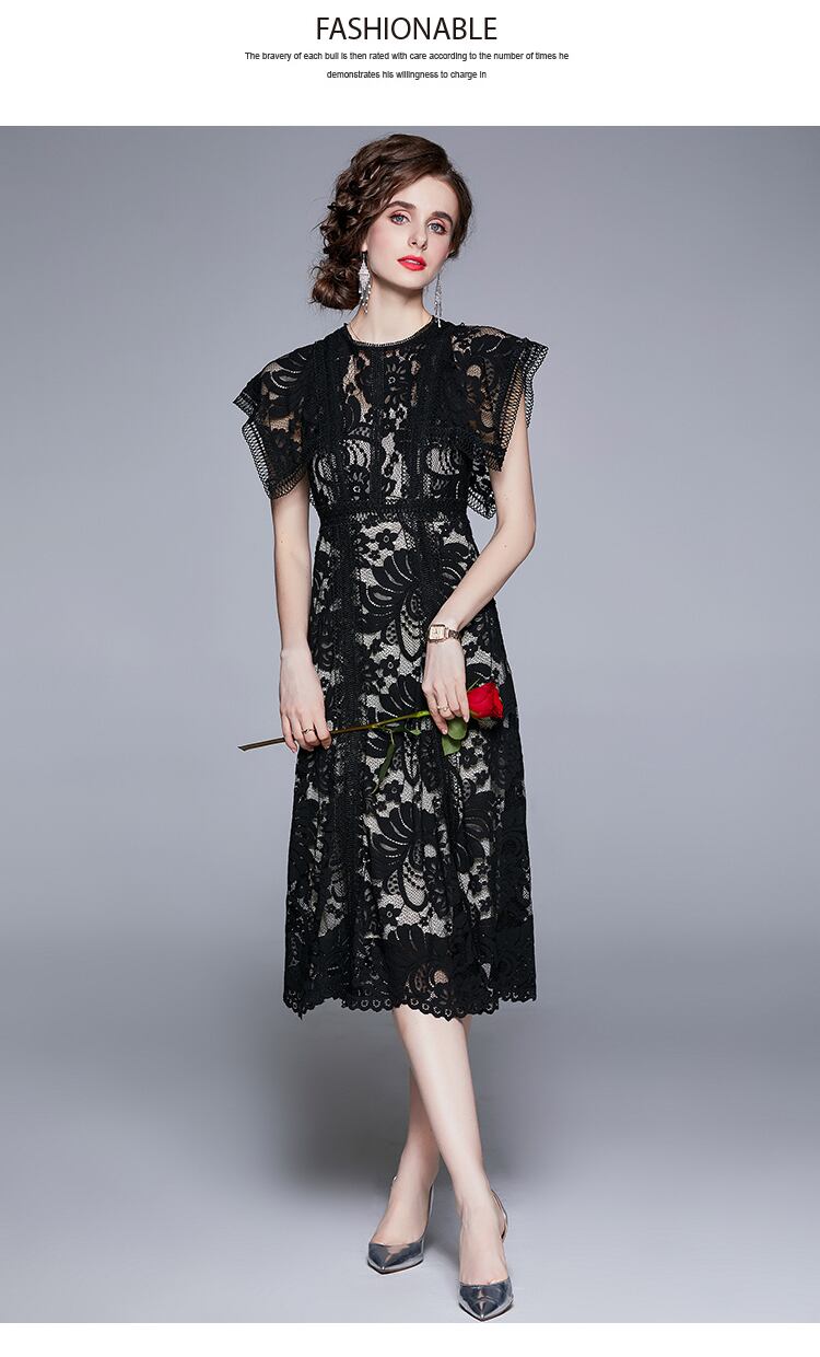 ブラック レース中空アウト サマー ドレス女性ノースリーブ ウエスト気質ドレス 夏物