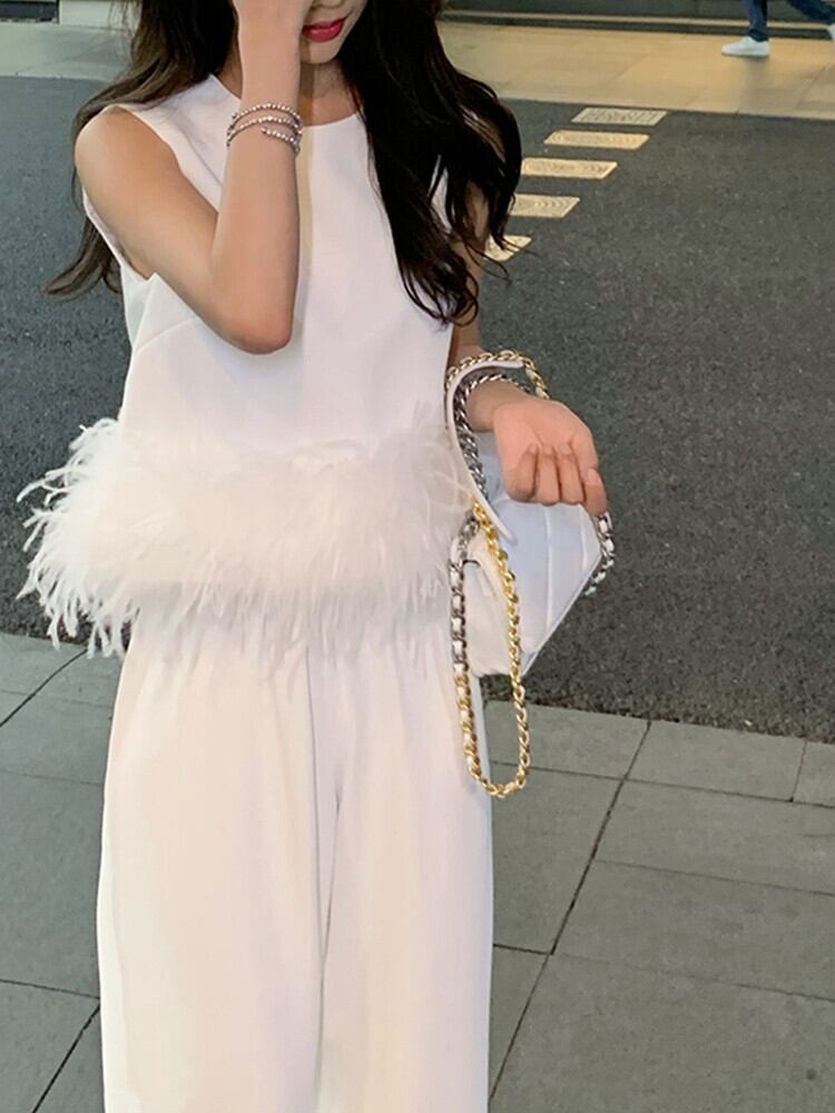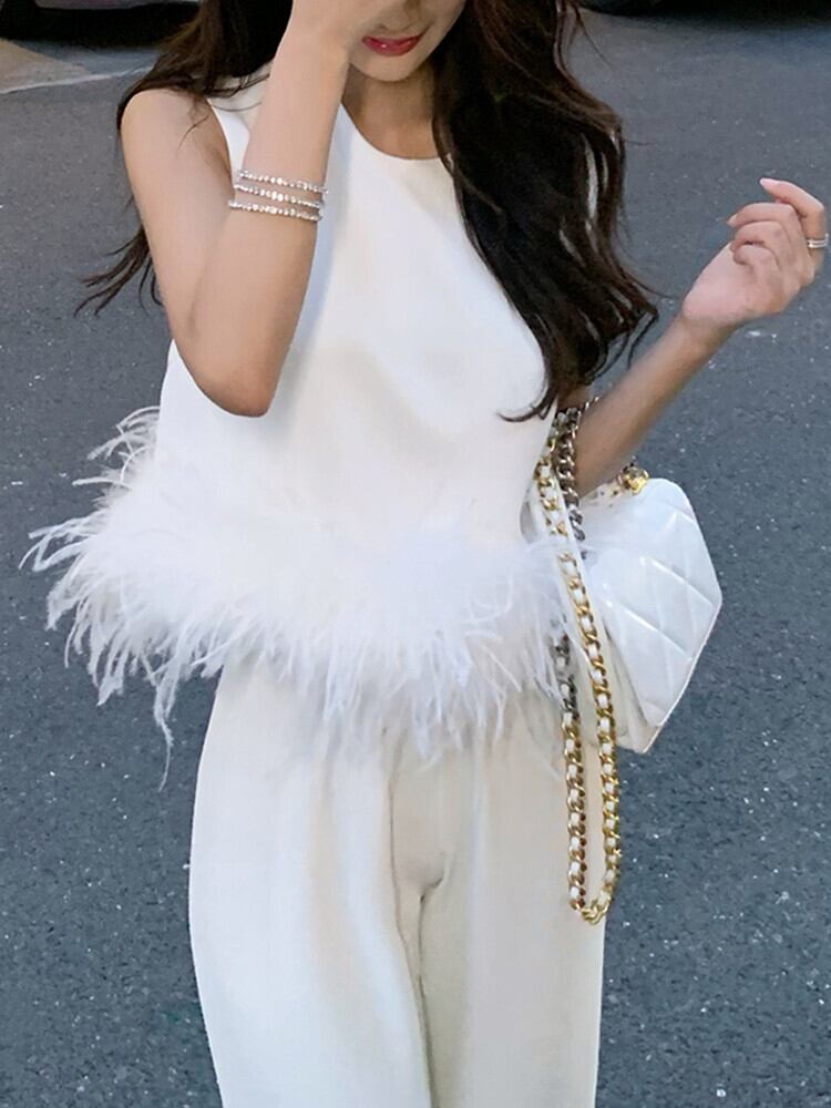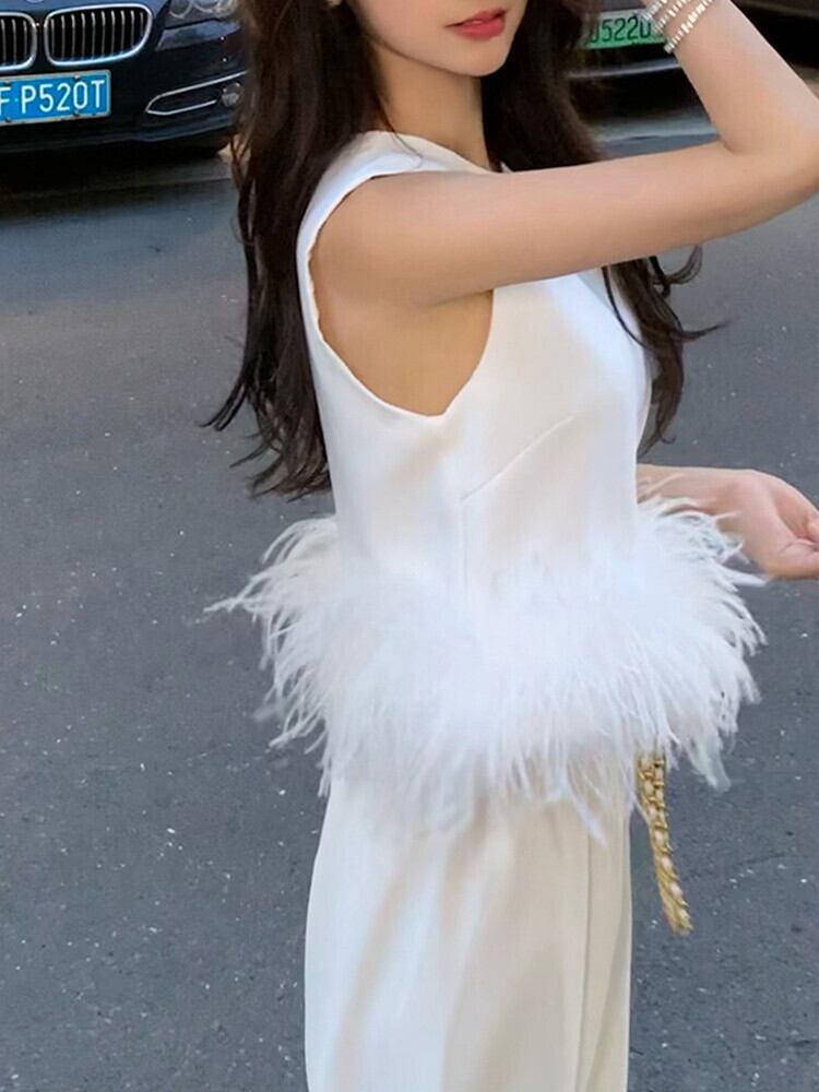 SMTHMA 夏ライト高級セレブ気質ノースリーブ ベスト女性の白いダチョウの髪トップ ホワイト サマー 夏物