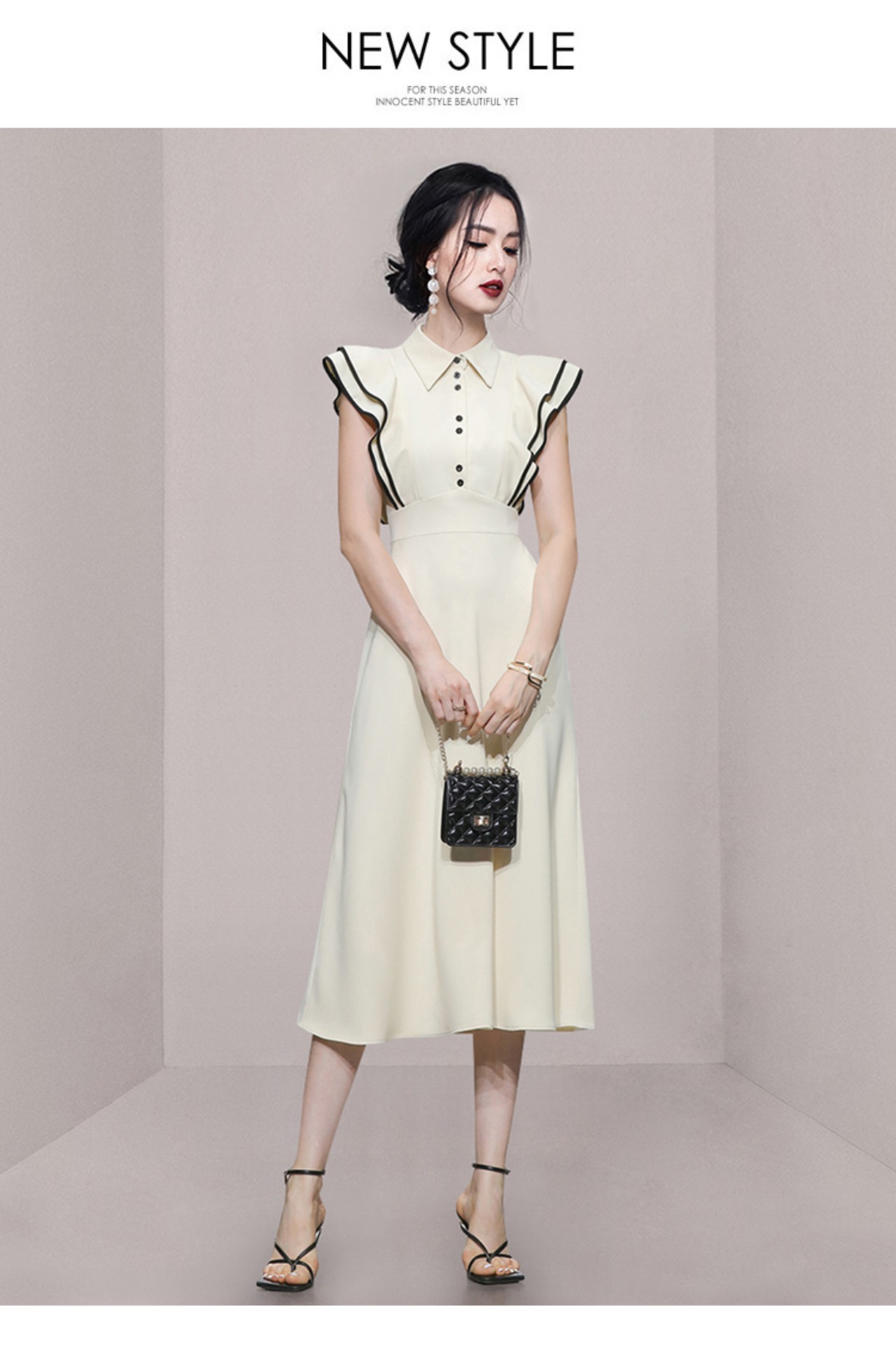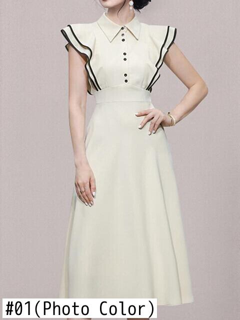 SMTHMA 夏スタイルパッチワークフリルスリーブドレス女性オフィスレディシックな甘いターンダウン襟 Vestidos 大人ガーリー スウィート キュート カジュアル サマー 夏物 会社 学校 通勤や通学にも