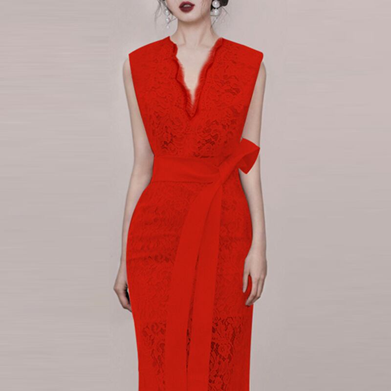 ブラック/ホワイト ボディコン レース ロング ドレス女性夏の弓レースアップ中空ノースリーブ ドレス Vestido リボン サマー 夏物