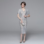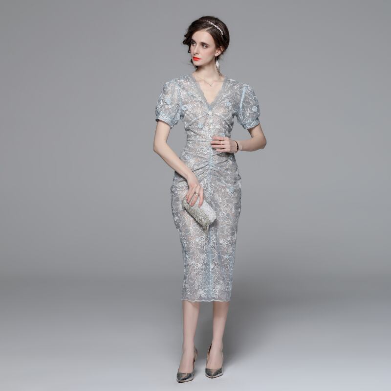 SMTHMAブルーパフスリーブVネックダイヤモンドスタッズシャイニーサマードレスウエストスリムウエストレース刺繍ドレス 夏物