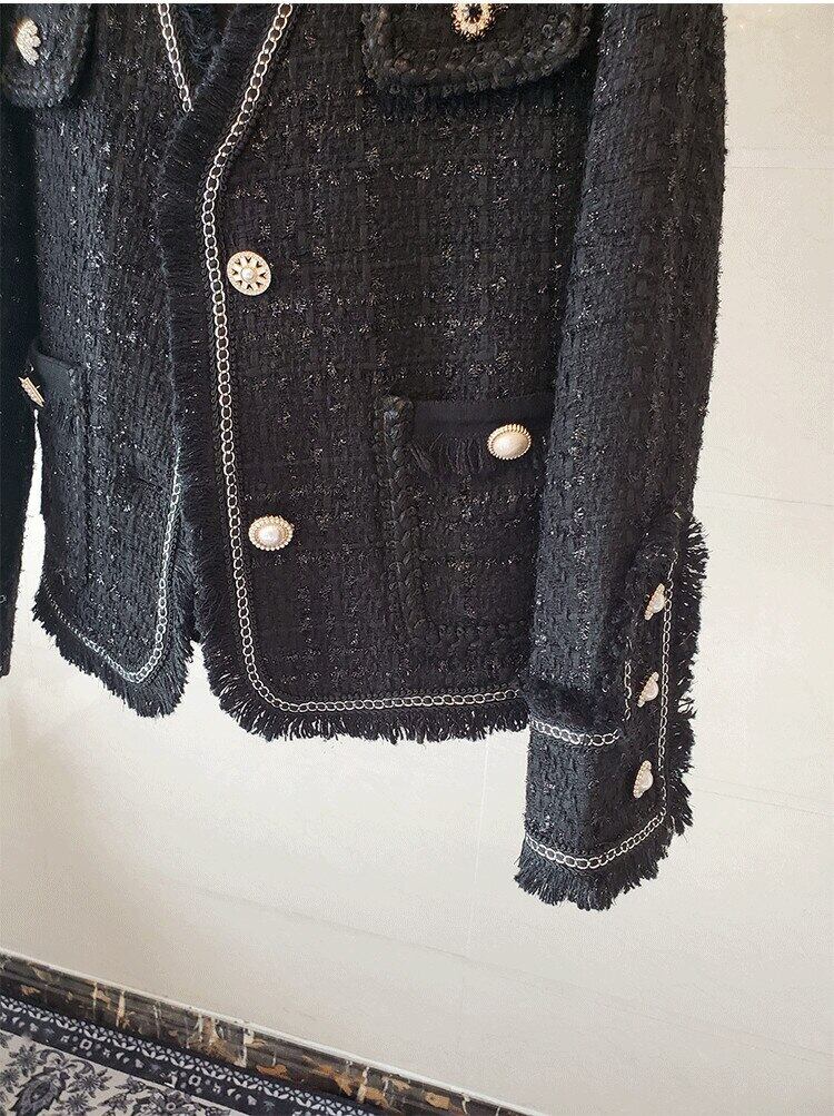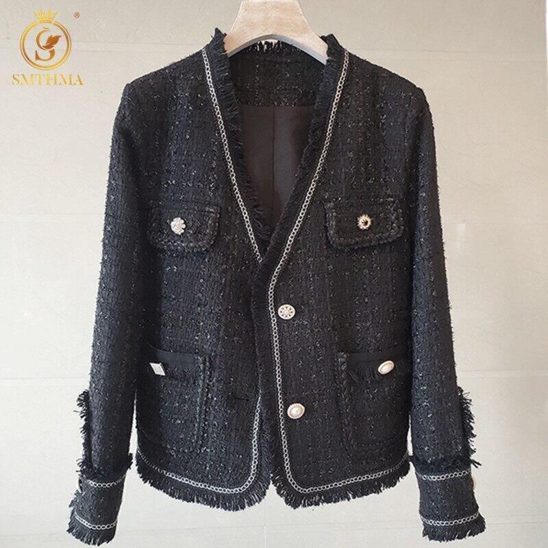 SMTHMA シックな黒ツイード ジャケット女性秋冬セクシーな V ネック Tel ウール コート アウターウェア ブラック オータム 秋物 ウィンター 冬物 Vネック