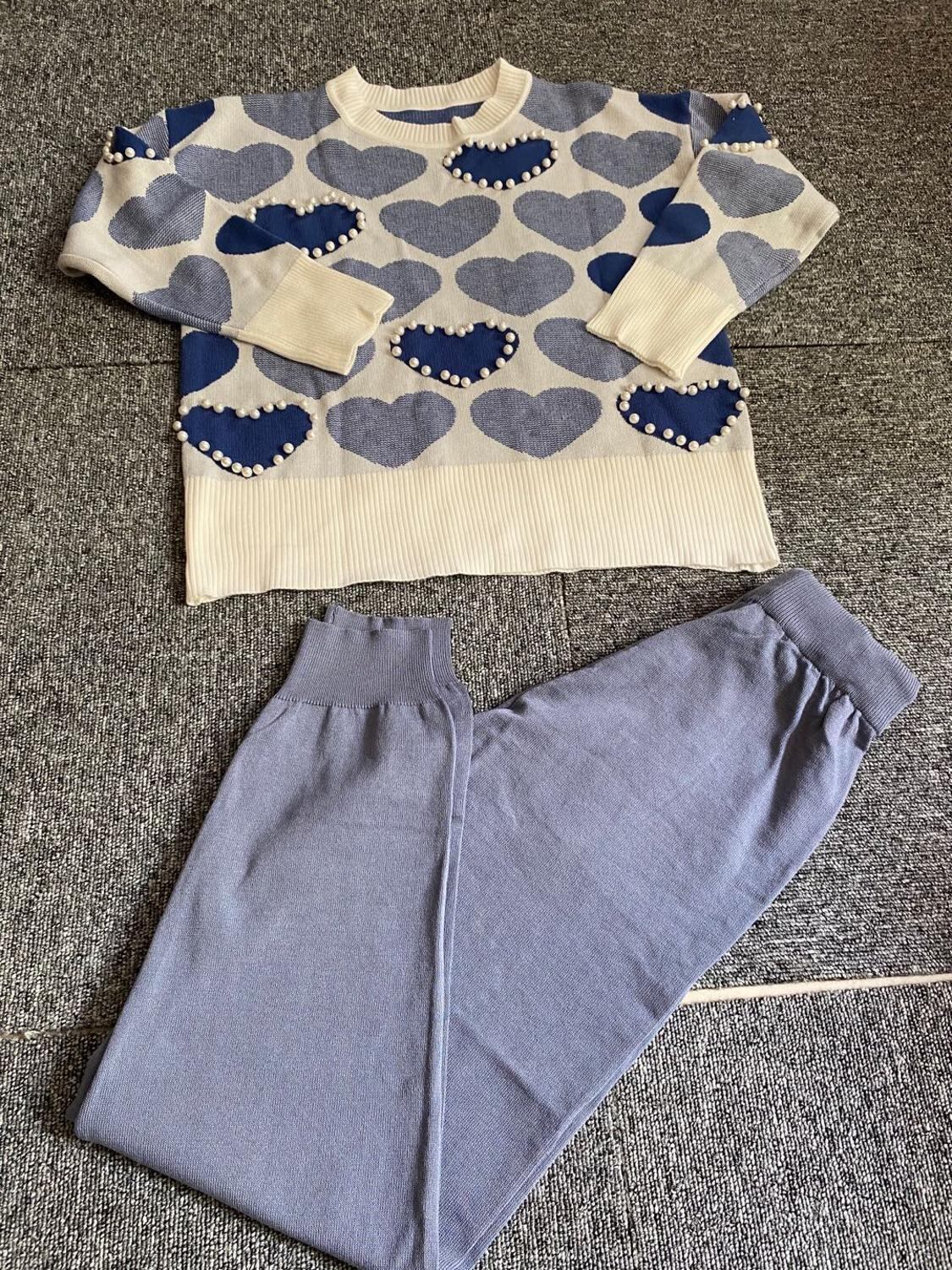 SMTHMA 夏半袖スウィートラブパターン女性ツーピースセット真珠プルオーバーセーター + 弾性ウエストパンツ 2 点セット ショート ハーフスリーブ エラスティック 伸縮 大人ガーリー キュート カジュアル サマー 夏物 パール | two