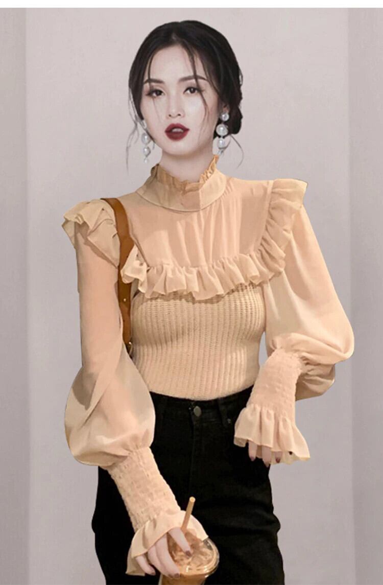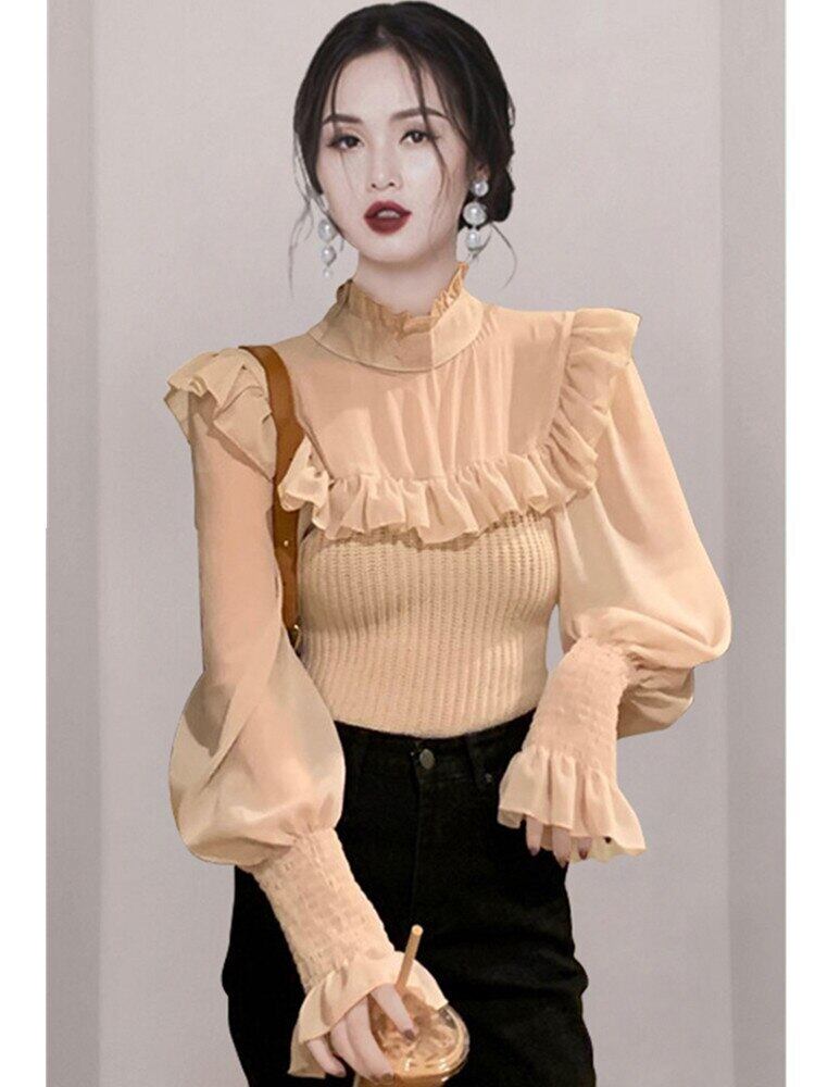 SMTHMA 秋のフランスの女性トップ スタンド カラー長袖フリル シャツ ロング オータム 秋物