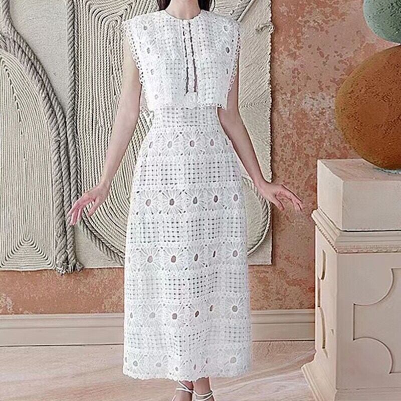 SMTHMA 高級滑走路ホワイト レース中空 Ou ドレス女性ウエスト ノースリーブ サマー ドレス Vestidos 夏物